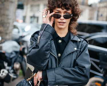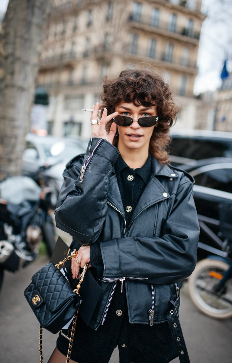 Outfit idea: Go full contrast — pair a black leather biker with a silk slip dress and ankle boots. Add layered silver jewelry for that “cool without trying” finish.