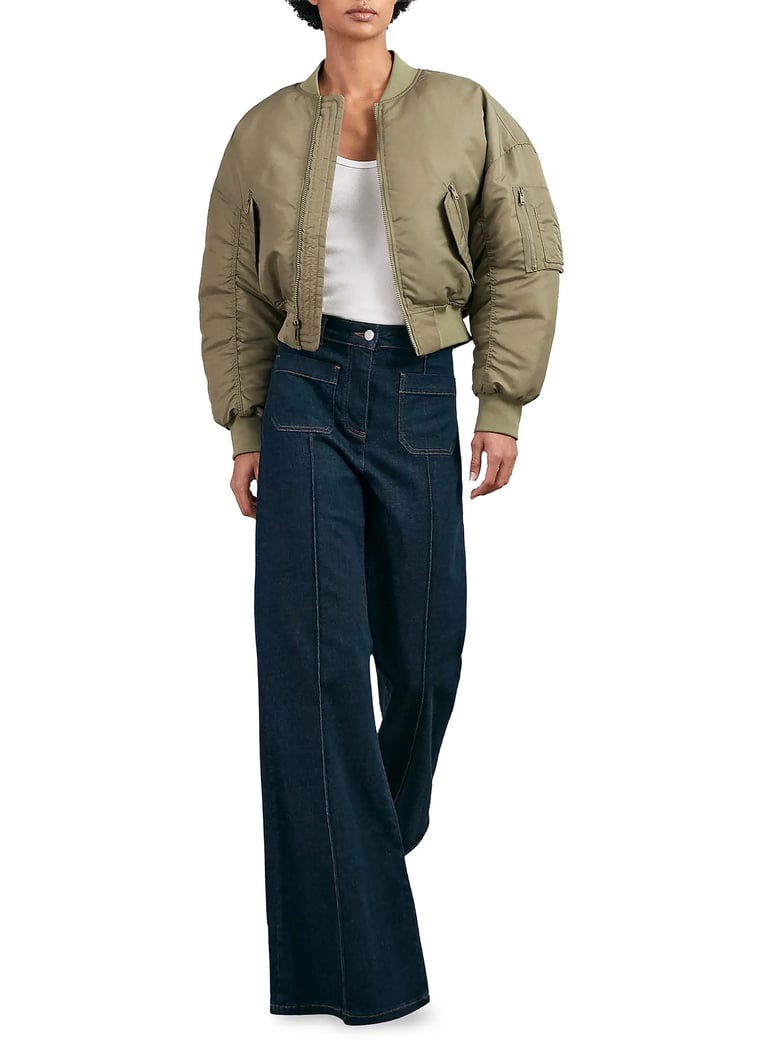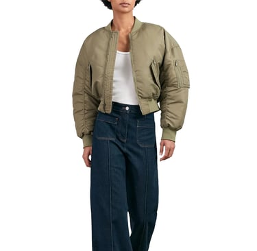 Outfit idea: Pair a cropped khaki bomber with high-waisted trousers, a fitted white tank, and chunky sneakers. Add gold hoops and a messy bun for that effortless “didn’t try, but totally nailed it” vibe.
