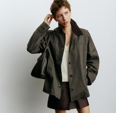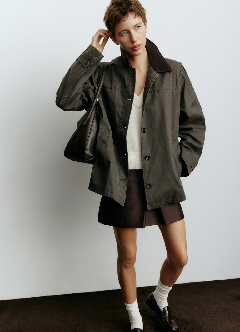 Outfit idea: Style an olive barn jacket with a cream knit, dark straight-leg jeans, and loafers. Add a structured shoulder bag to balance rugged charm with urban sophistication.