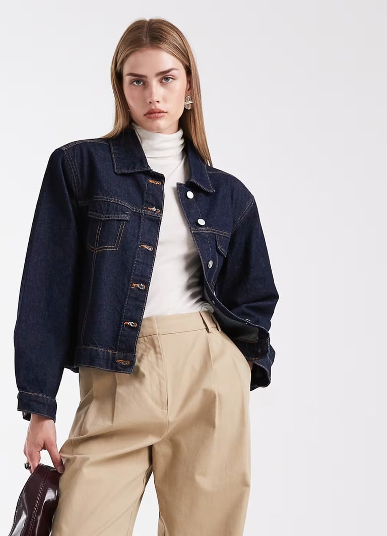 Outfit idea: Layer a boxy light-wash denim jacket over a turtleneck mini dress and knee-high boots. Throw on a leather tote, and you’ve got an outfit that’s both casual and city-chic.