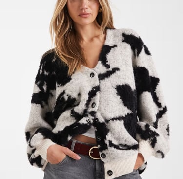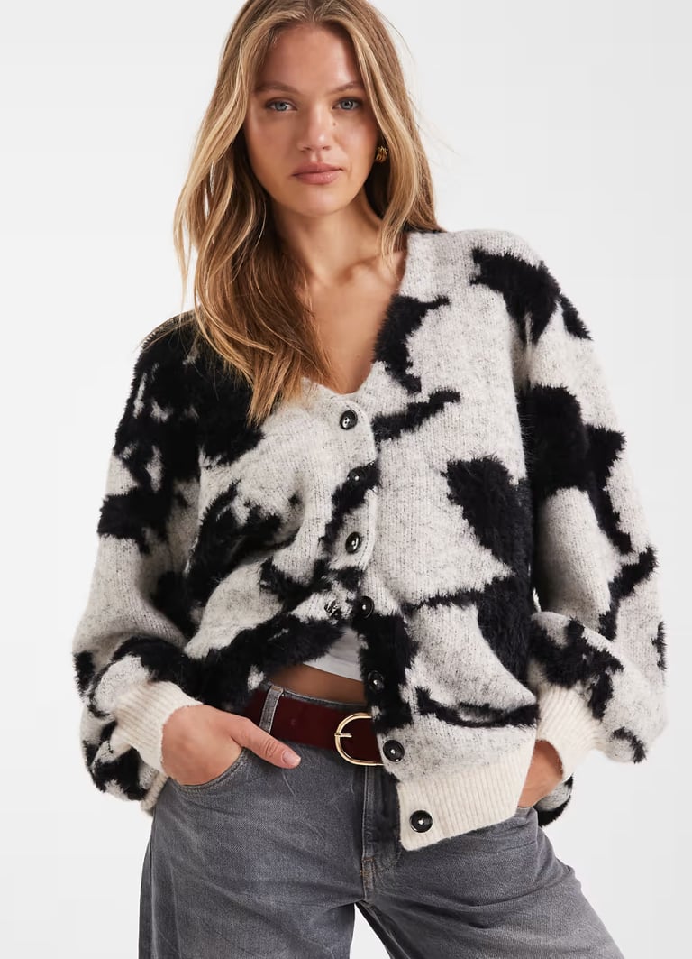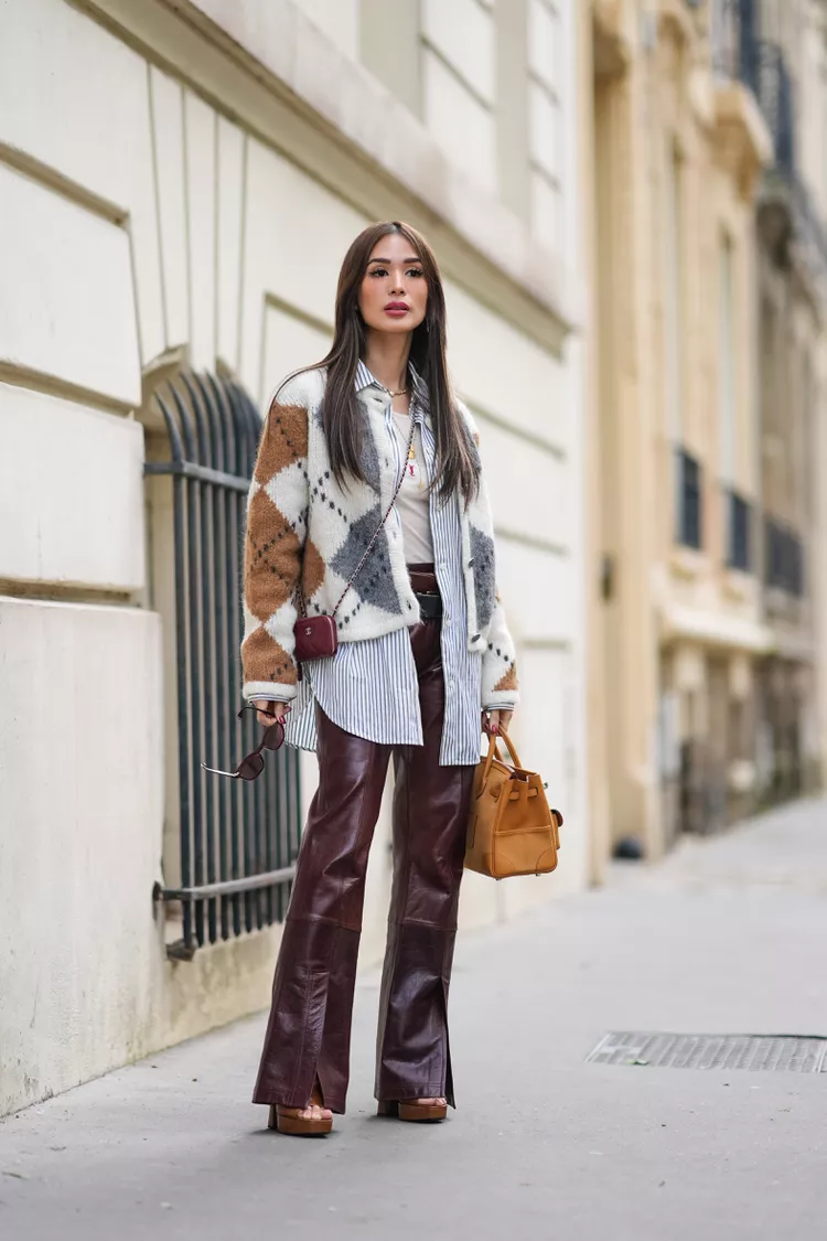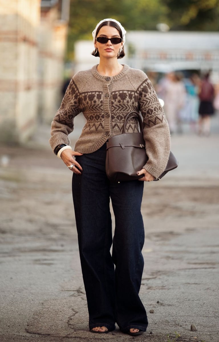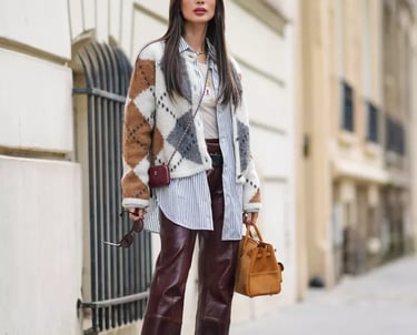 Take a fair isle, argyle, or intarsia cardigan and clash it with an unexpected piece — say a leather mini or a vinyl trouser. Texture conflict is your friend. Let the cardigan be the cozy anchor while your bottoms raise eyebrows.