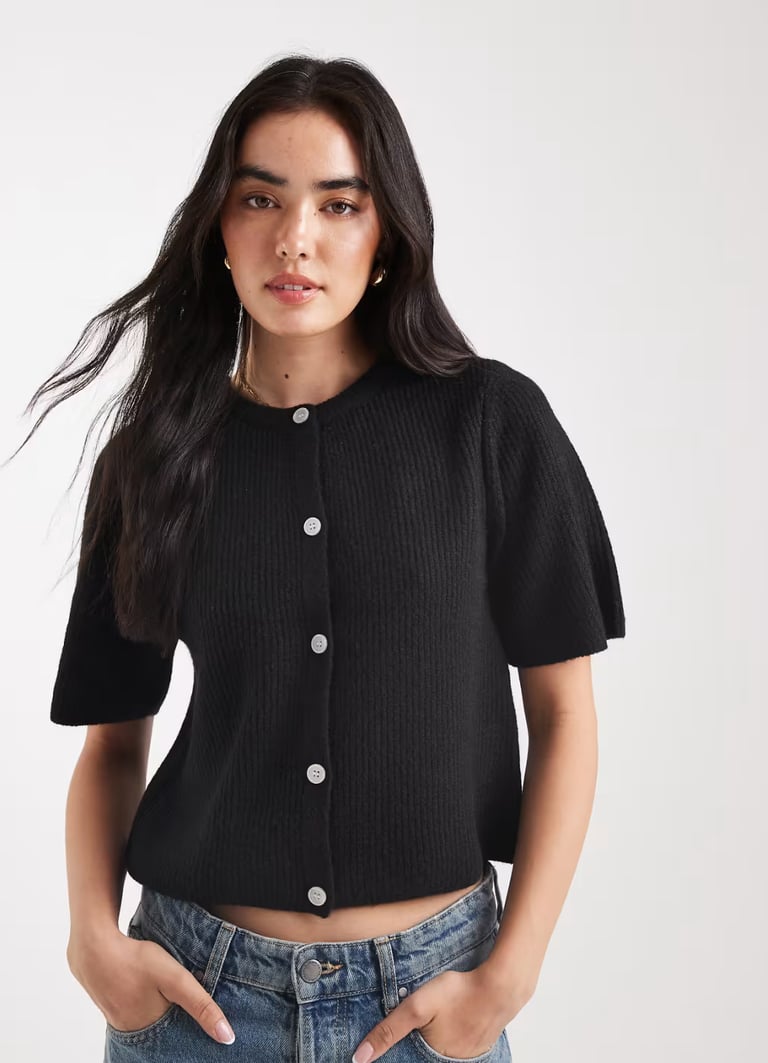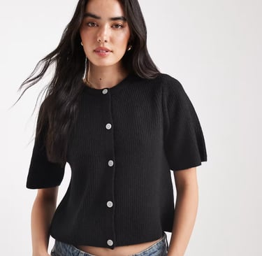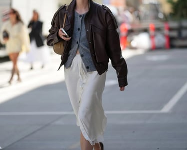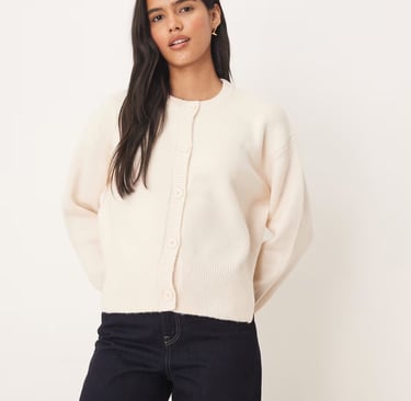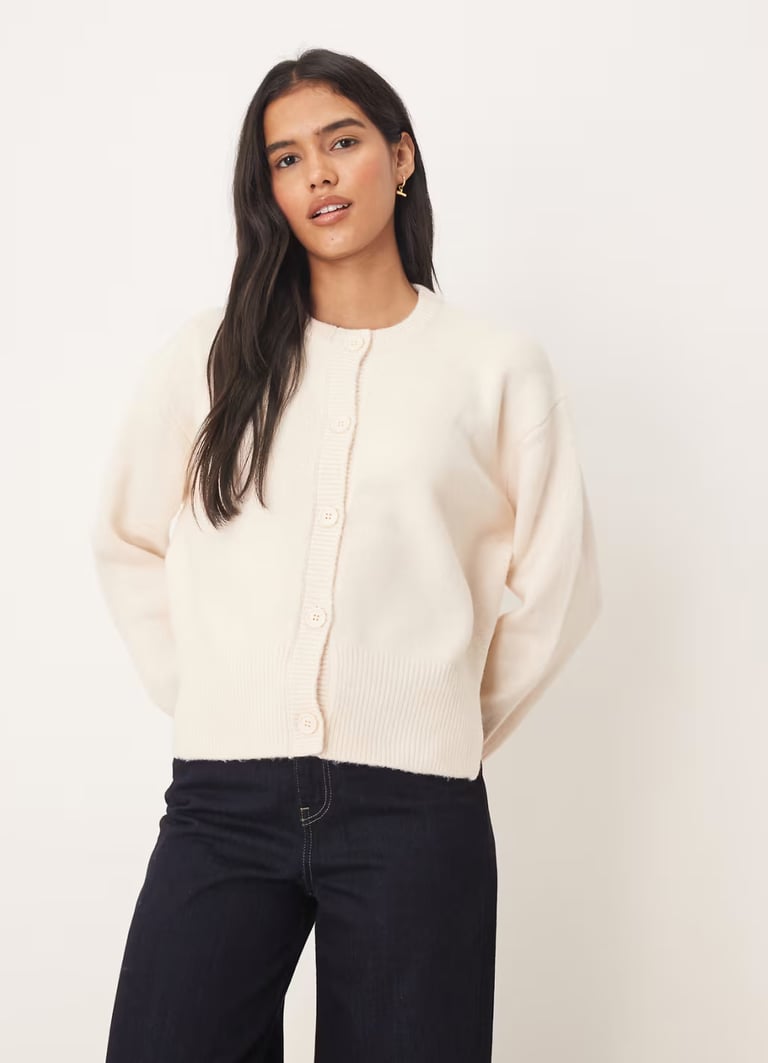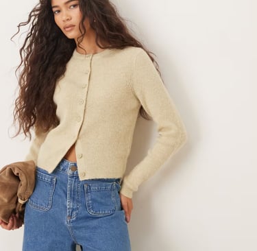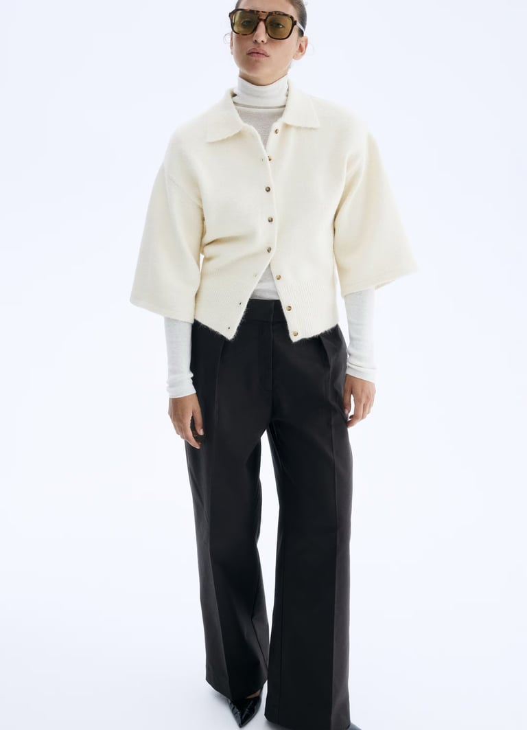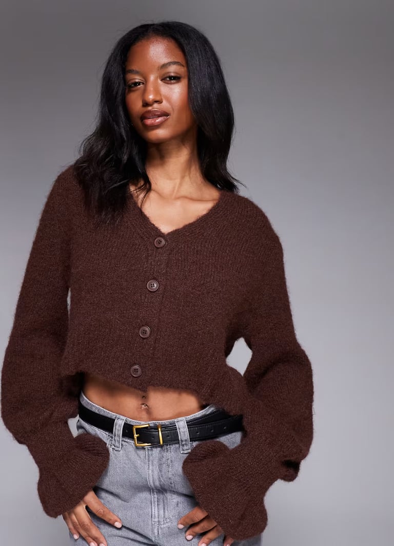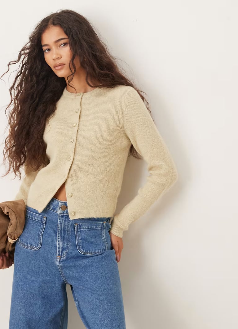 Pick a waist-defining cardigan (think cinched or shortened) and pair it with ultra high-waisted wide-leg jeans or a midi satin skirt. Sneaker or block heel — either way, you’re giving shaped silhouette, not shapeless silence.