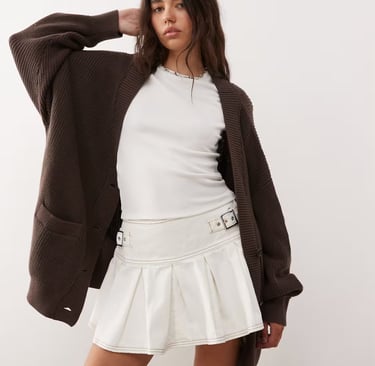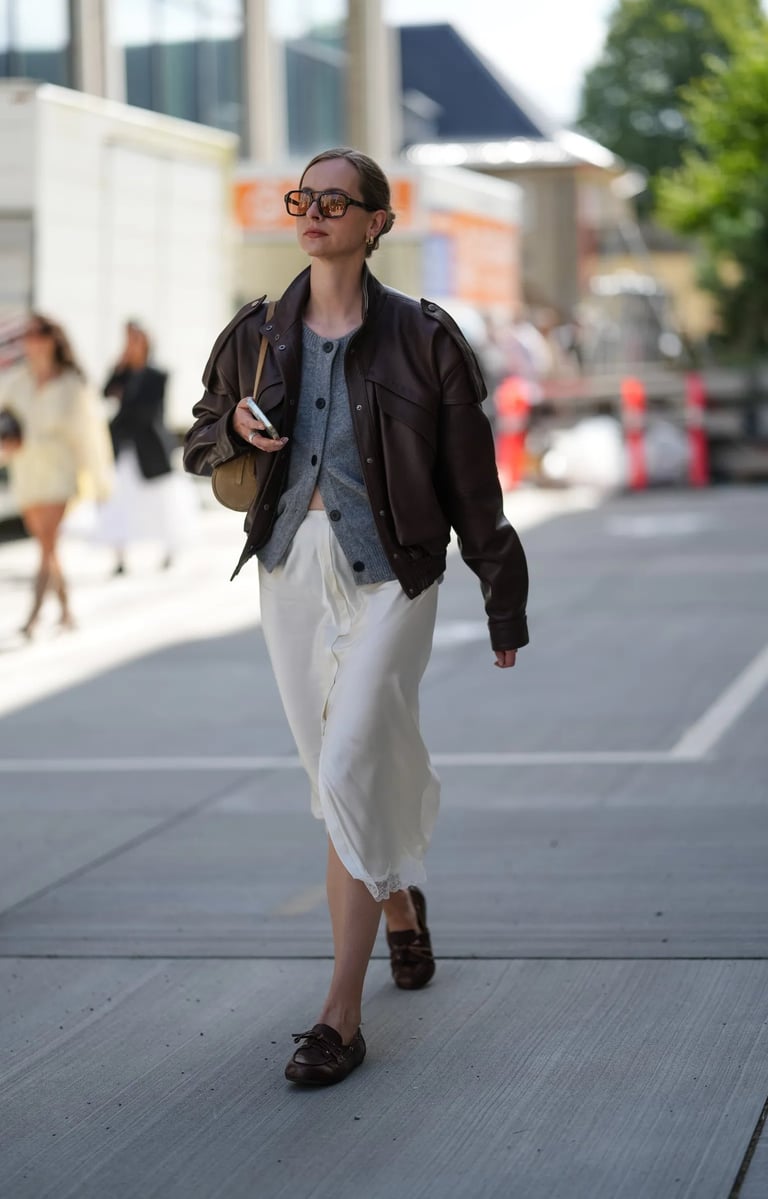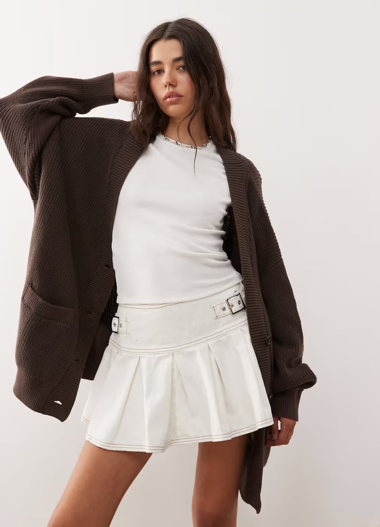 Oversized slouchy cardigan unbuttoned, worn over a slip dress or tailored shorts. Throw on a belt bag and square sunglasses. It’s a transitional-weather trick: knitwear, but make it coatish.
