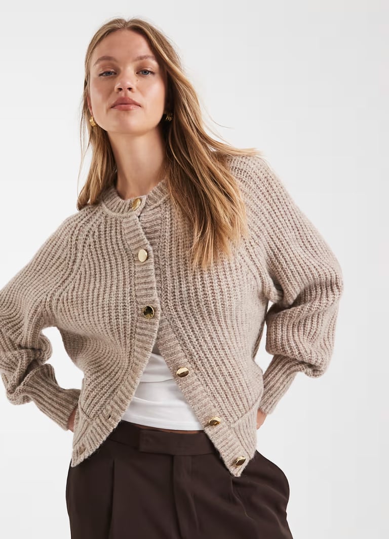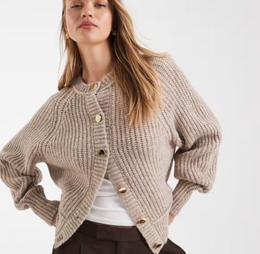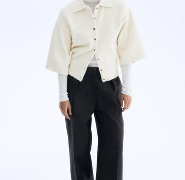 A longline ribbed cardigan in oatmeal, buttoned halfway over a crisp white tee and architectural black trousers. Add chunky loafers and tiny gold hoops. The kind of outfit that says, I edit but I don’t try too hard.
